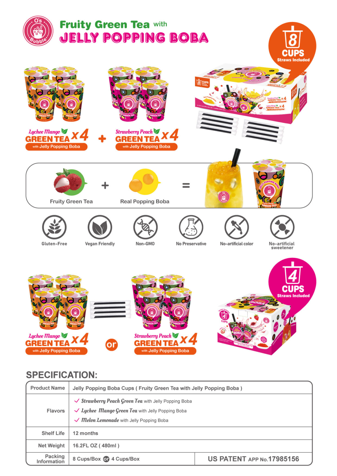 O’s Bubble Fruity Green Tea with Jelly Popping Boba serving with 2 flavors, for 4 various fruits! And the one and only Jelly Popping Boba by O’s Bubble offers the innovative taste of real juice wrapped up in a jelly-like texture, pushing the trend of Boba drink to the next level!
