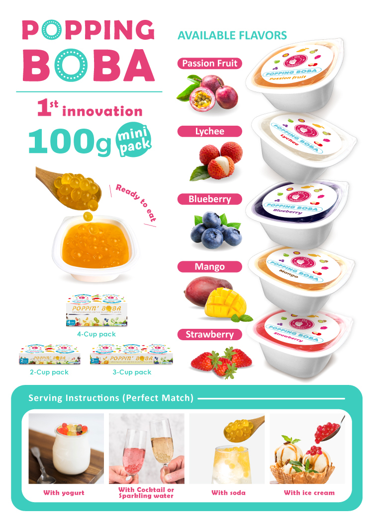Get ready for an exciting twist with our ready-to-eat popping boba that breaks the monotony of everyday routines. Experience a delightful burst of flavor as the boba pops in your mouth. Add some excitement to your tea, soda, dessert, yogurt and more!
