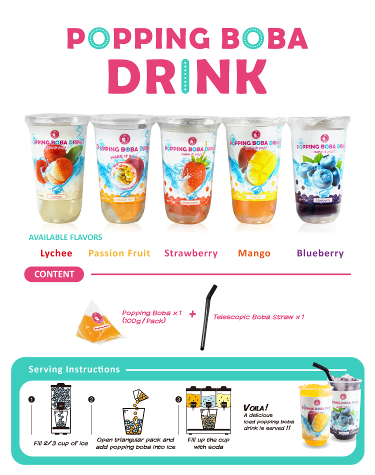Get ready for an exciting twist with our ready-to-eat popping boba that breaks the monotony of everyday routines. Experience a delightful burst of flavor as the boba pops in your mouth. Add some excitement to your tea, soda, dessert, yogurt and more!