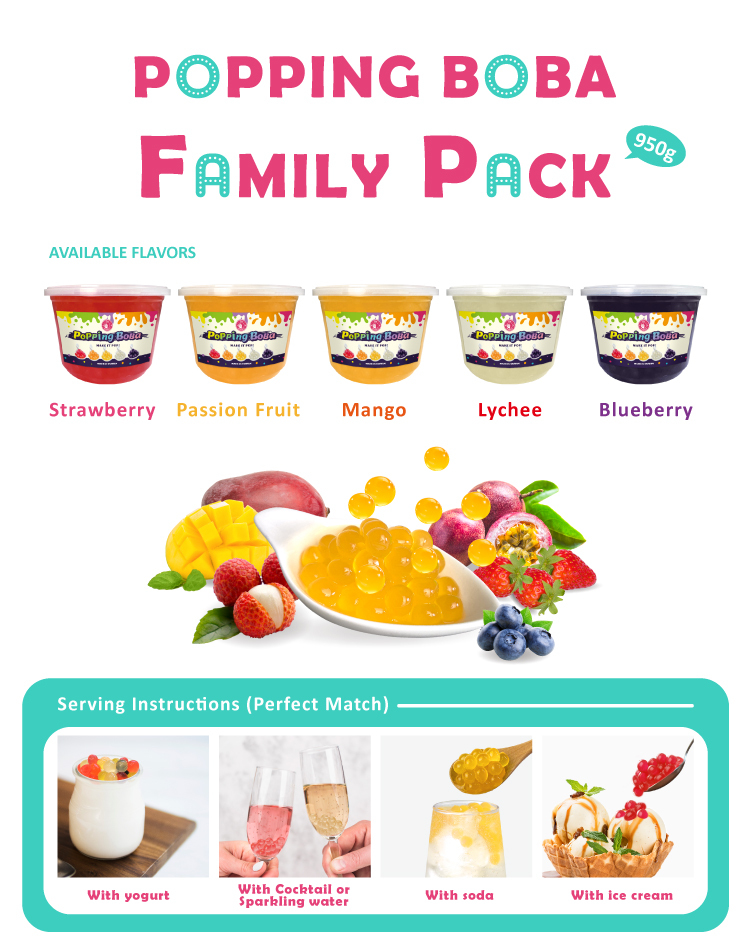 Get ready for an exciting twist with our ready-to-eat popping boba that breaks the monotony of everyday routines. Experience a delightful burst of flavor as the boba pops in your mouth. Add some excitement to your tea, soda, dessert, yogurt and more!