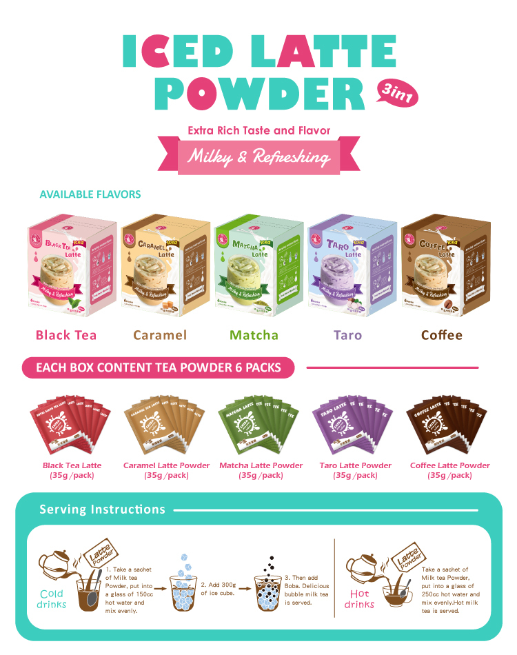 O’s Bubble Tea Latte Powder offers a delightful selection of flavored teas that you can enjoy right at home! Take a sachet of your O’s Bubble Tea Latte Powder and mix evenly with a glass of 150cc hot water to enjoy. Prefer your tea chilled? Just add 300g of ice cubes to enjoy your refreshing tea! You can also customize the sweetness of your tea by adding milk or non-dairy alternatives. Enjoy your O’s Bubble Tea Latte whenever you need a delicious energy booster in your day! Tea flavors include black tea latte, matcha latte, taro latte, caramel latte, and coffee latte.